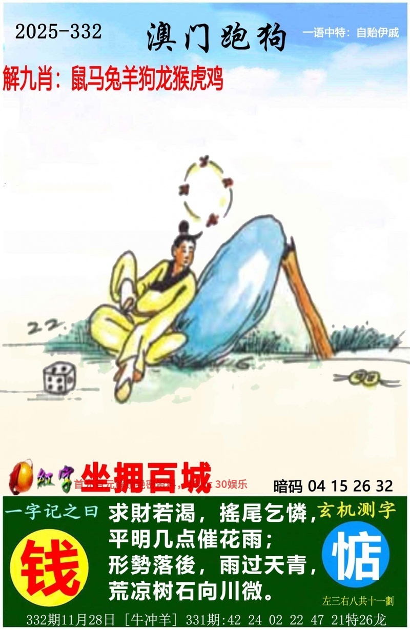 332期一字記之曰:【钱】金銀財足:求財若渴,搖尾乞憐,平明几点催花雨;形勢落後,雨过天青,荒凉树石向川微。玄機測字:《惦》 解:形勢落後,雨过天青,野兽:虎龙蛇兔猴鼠 综合取肖:虎龙蛇兔猴鼠 ![]() |